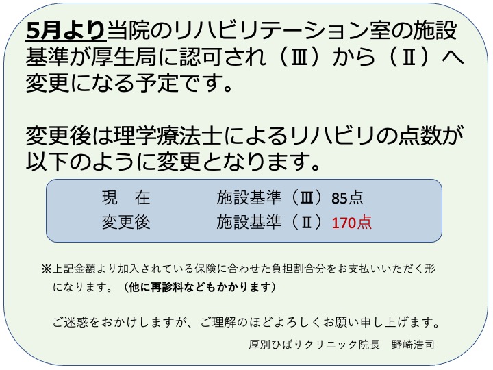 以前、他のクリニックで施設基準(Ⅱ)のリハビリに通っていた方は、「あれ、厚別ひばりクリニックは安い」と思われていたかもしれませんが、理由は施設基準が違っていたためです。今後は、ほぼ同じ料金になる予定です。