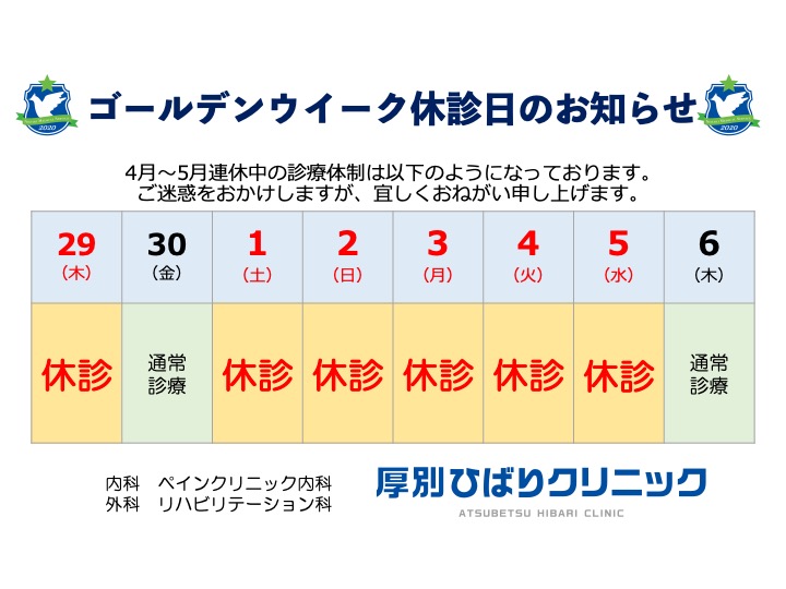 厚別ひばりクリニックは5月1日土曜日を休診とさせていただくため、連休中の診療日、休診日は以下のようになります。