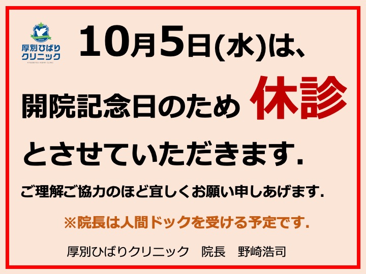 来月、10月で当院は開業から3年目に入ります。ここまで支えてくれたスタッフに感謝し、10月5日は開院記念日で休診とさせていただきます。