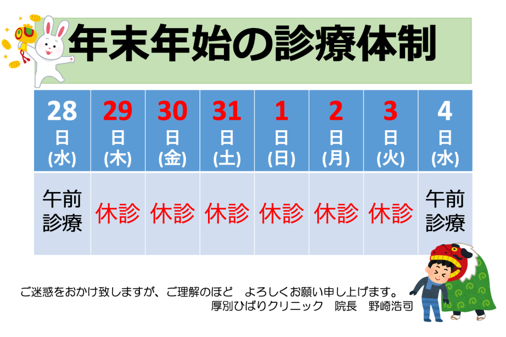 今月は12月28日水曜の午前診療で通常診療を終わらせて頂きます。年始は4日の午前診療から開始といたします。