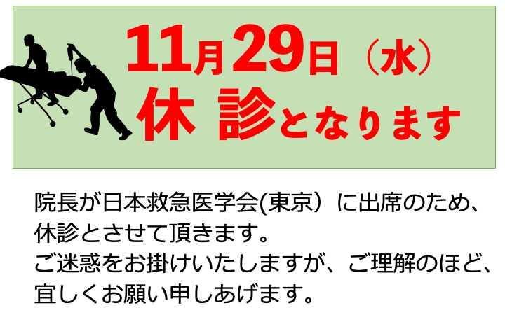 11月29日水曜日は院長の出張により休診とさせて頂きます。ご理解のほど、よろしくお願い申しあげます。